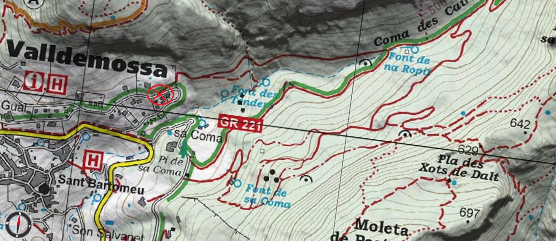 Mapa: En el Mallorca Tramuntana Sur E-25 de la Editorial Alpina, están todos los caminos que transitamos y los puntos de referencia principales