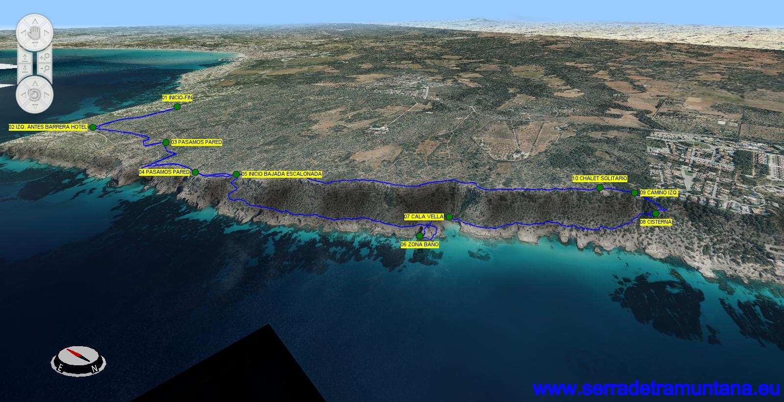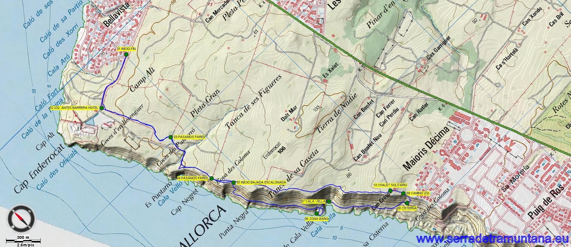 Vamos bajando por el evidente camino escalonado y antes de llegar a nivel del mar, iremos virando hacia la izquierda, para pasar por encima de Sa Pesquera Prima y Es Racó des Cap Negret. A partir de aquí, nuestro sendero discurre entre 15 y 20 m. sobre el nivel del mar. Así pasaremos sobre Sa Ferradura y Cala Veió; pequeño rincón previo a Cala Vella, donde aprovechamos para darnos un buen chapuzón (WP06), ya que vimos que en ese momento había demasiado alboroto en la cala.