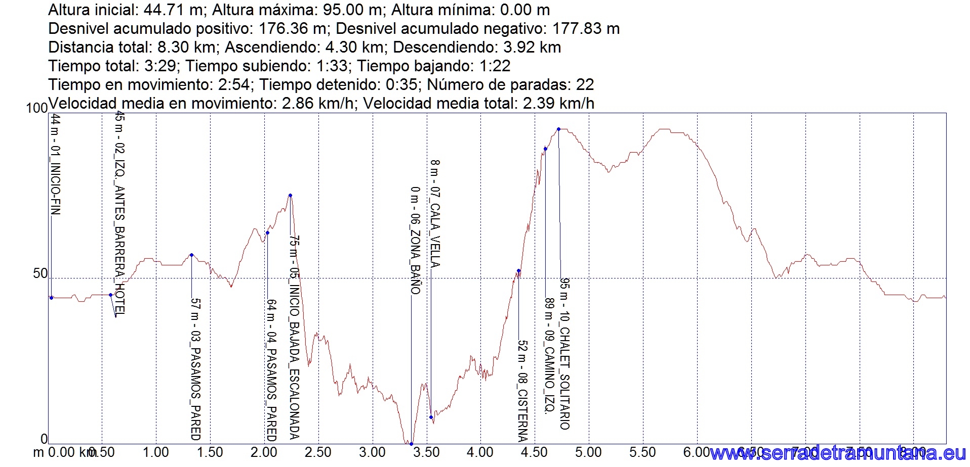 La ruta de hoy no tiene ninguna complicación especial empezando desde la urbanización de Bellavista. Sí tiene el interesante aliciente de darse un buen baño en Cala Vella o en la zona del balneario del Hotel Delta, siempre que hagamos la ruta en días de calor y el estado del mar lo permita.