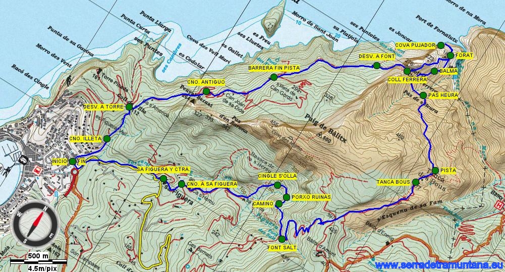 También debe tenerse en cuenta a la hora de realizar esta ruta el cambio de estado de las casas de Sa Coma, entre el Cingle de s’Olla y Sa Figuera. Cuando pasamos en el 2004, eran unas casas deshabitadas y en obras, sin barreras que representasen un problema de paso. Actualmente están habitadas y tuvimos que abrir y cerrar un par de barreras para poder pasar. Aunque no tuvimos ningún problema, ya que no estaban cerradas con candado, creo conveniente pedir permiso a los propietarios antes de adentrarnos en esta finca. Si no, queda la alternativa de bajar por la pista habitual desde la Font des Salt, que hacia la izquierda –Suroeste, se dirige hacia Cas Bernats y el Coll d’en Marquès.