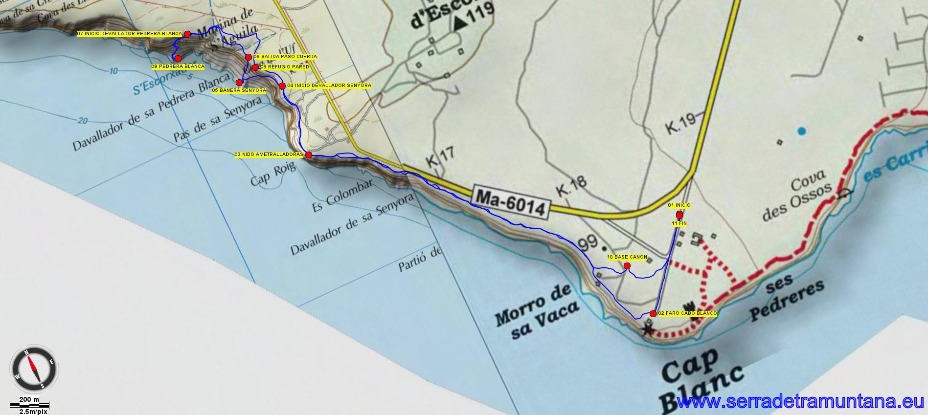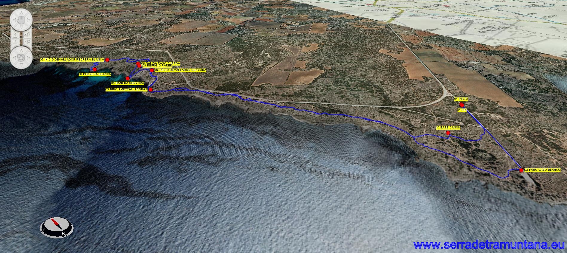DESCRIPCIÓN DEL ITINERARIOIniciamos la ruta aparcando en las inmediaciones del faro del Cap Blanc (WP01), que se llega por un desvío a la derecha después del kilómetro 18 de la carretera Ma-6014. Por esta misma carreterilla nos acercamos hasta las inmediaciones del faro (WP02) y al llegar a la barrera que nos cierra el paso, salimos por la derecha para acercarnos a la línea de los acantilados.