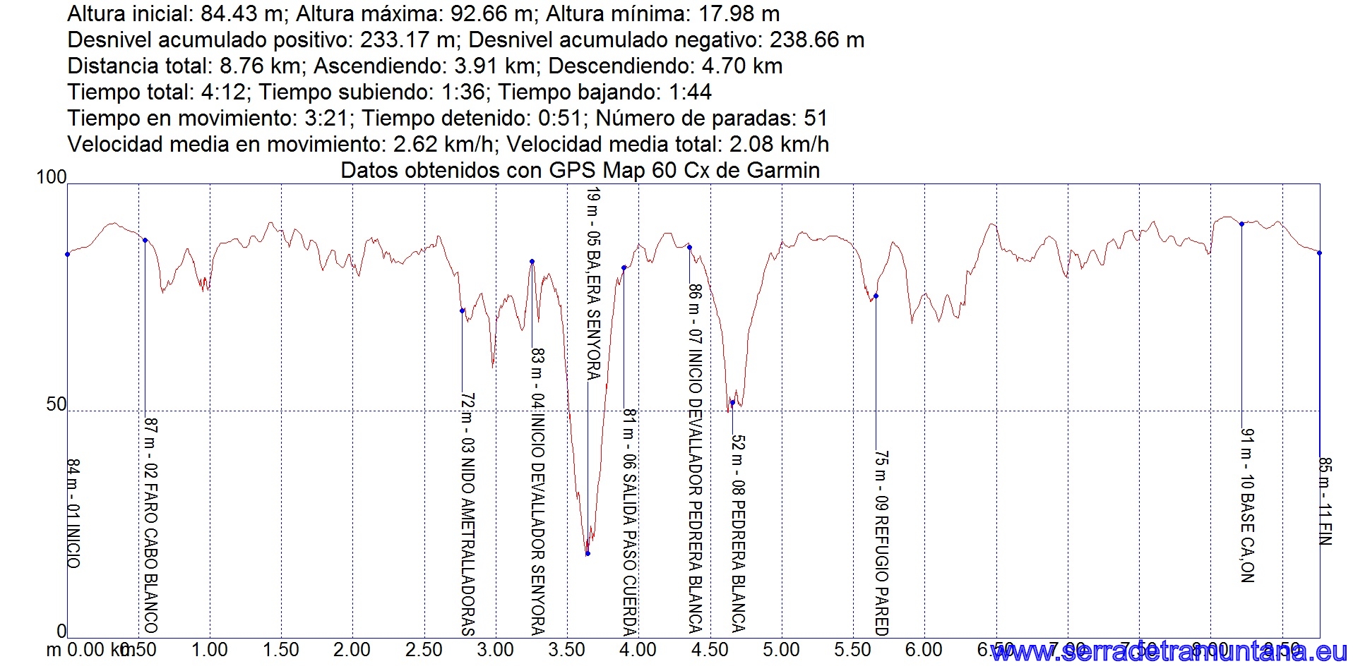 También merece la pena advertir, que la señal del GPS en las paredes de los acantilados es poco precisa, por lo que he tenido que arreglar el track; a pesar de ello las líneas de track en las paredes y en la zona de mar, deben tomarse como orientativas. También hay que tener en cuenta, que en el perfil de la ruta, tampoco están bien las cotas más bajas, ya que en la zona de la bañera llegamos a nivel del mar y en la pedrera nos quedamos a unos 4 ó 5 m., ya que aquí no baje hasta el mar, si no que me quedé en la repisa; problema imagino, de la baja cobertura del GPS.