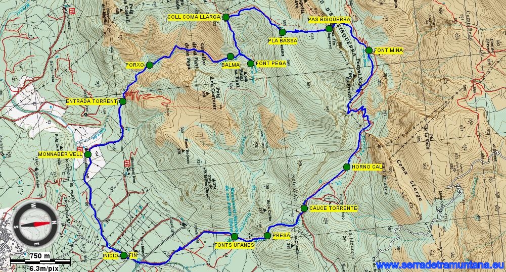 Para llegar al inicio de la ruta, la zona de Ses Fonts Ufanes, tomamos la salida 37 de la autopista Palma-Alcúdia en dirección a las cuevas de Campanet por el camino de Na Pontons. Al llegar frente a la iglesia de Sant Miquel, tenemos a la izquierda la carreterilla que va hacia los dos Monnàber (Nou y Vell) y hacia Campanet. En ella dejamos el coche en un arcén terroso a la derecha de la carretera, junto a un cañar, y empezamos a caminar en dirección a Campanet.