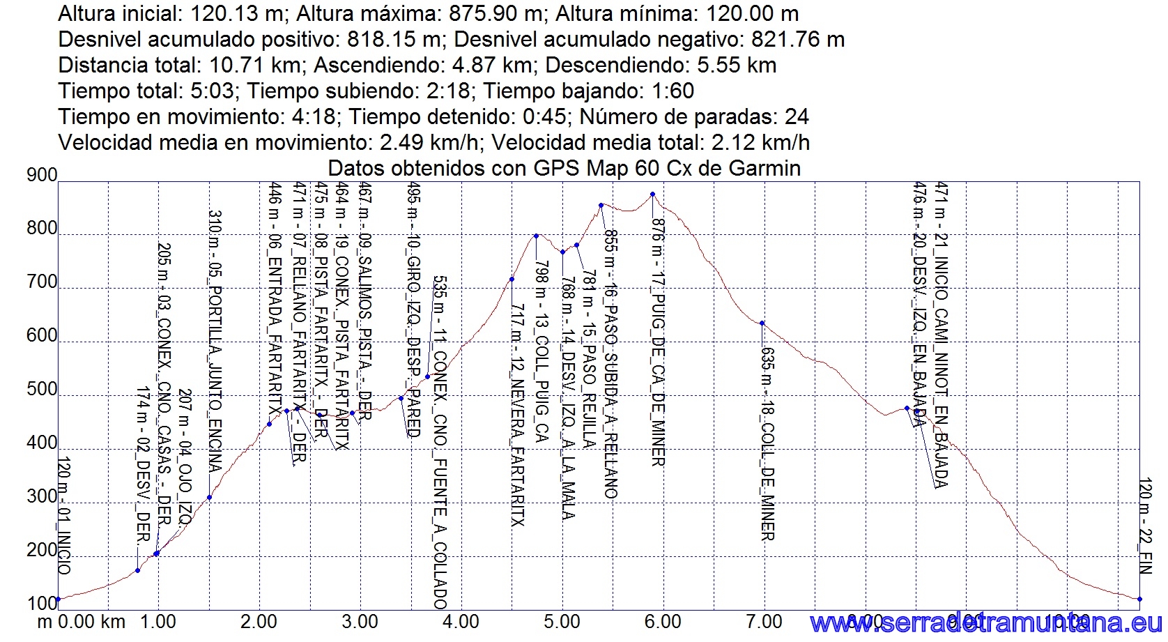 La ruta de hoy la iniciamos en el GR221, en la zona próxima a Pollença y nos adentramos por el Camí des Pujol o des Ninot para alcanzar el Puig de Ca de Míner, pasando por Fartàritx des Racó, la nevera de Fartàritx, y el collado, también de Fartàritx. El regreso lo hacemos cresteando hacia el Coll de Míner y desde aquí de nuevo a Fartàritx des Racó y bajada igualmente por el Camí des Ninot.Circular: Sí