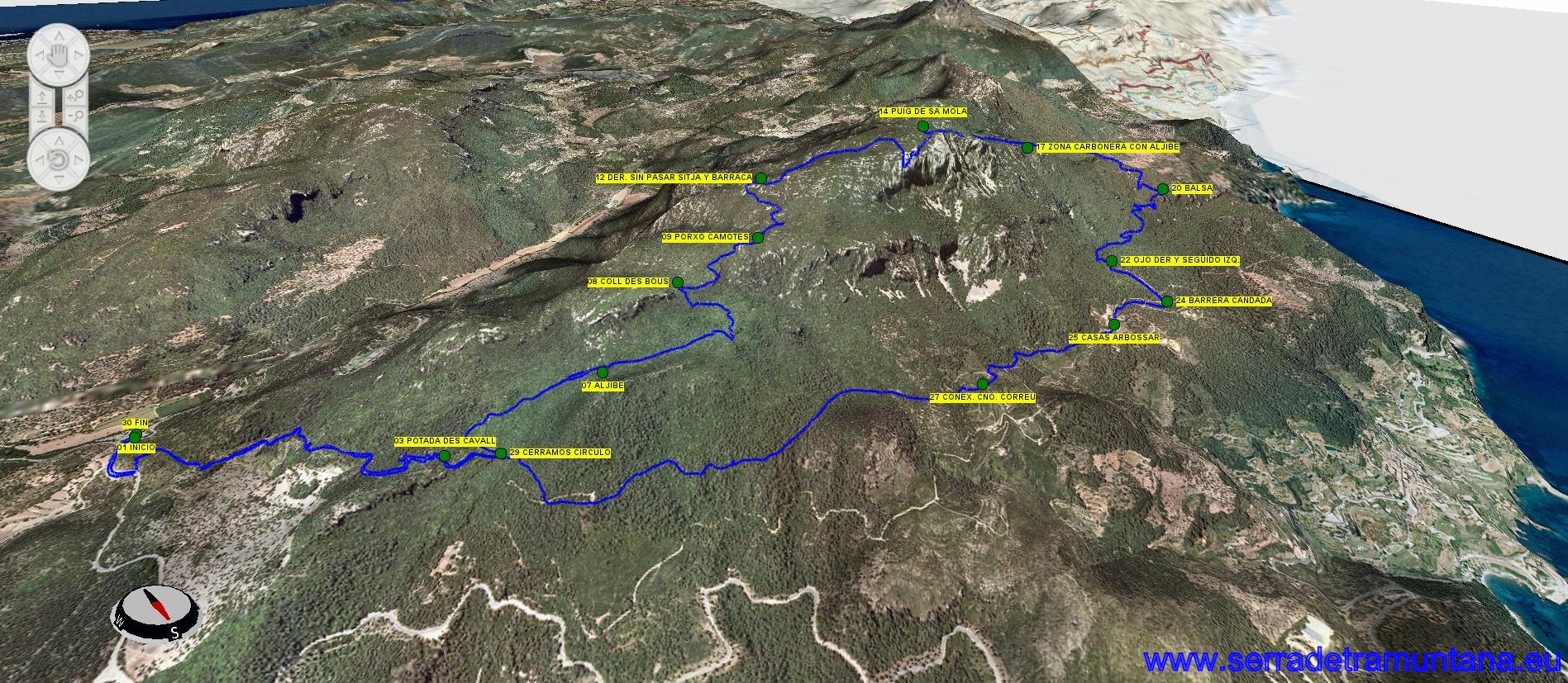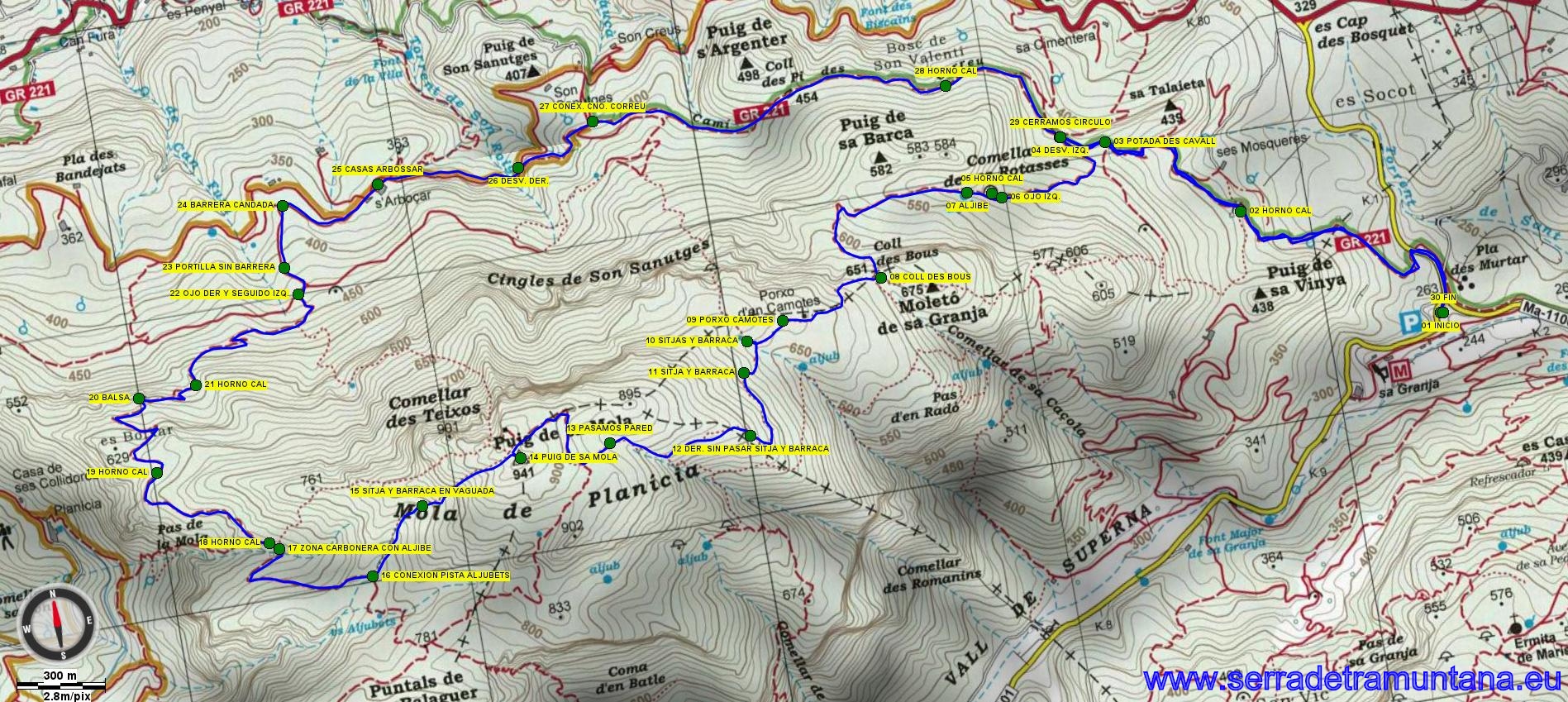 Hoy subimos al Puig de sa Mola de Planícia desde la Granja de Esporles. Empezamos subiendo un tramo del Camí de Correu (GR221), para desviarnos a la izquierda después de “Sa Potada des Cavall” y alcanzar el Coll des Bous. En el collado giramos a la derecha para ir ascendiendo por caminos y zonas carboneras, pasando por el “Porxo d’en Camotes”. Después de esta barraca seguimos por caminos, vaguadas y zonas carboneras, hasta alcanzar la cima del Puig de sa Mola. Después bajamos por el lado contrario a la subida, por una vaguada muy empleada por los carboneros, que desemboca en la pista “des Aljubets” y después ir hacia s’Arbossar y conectar de nuevo con el Camí des Correu para cerrar el circuito.