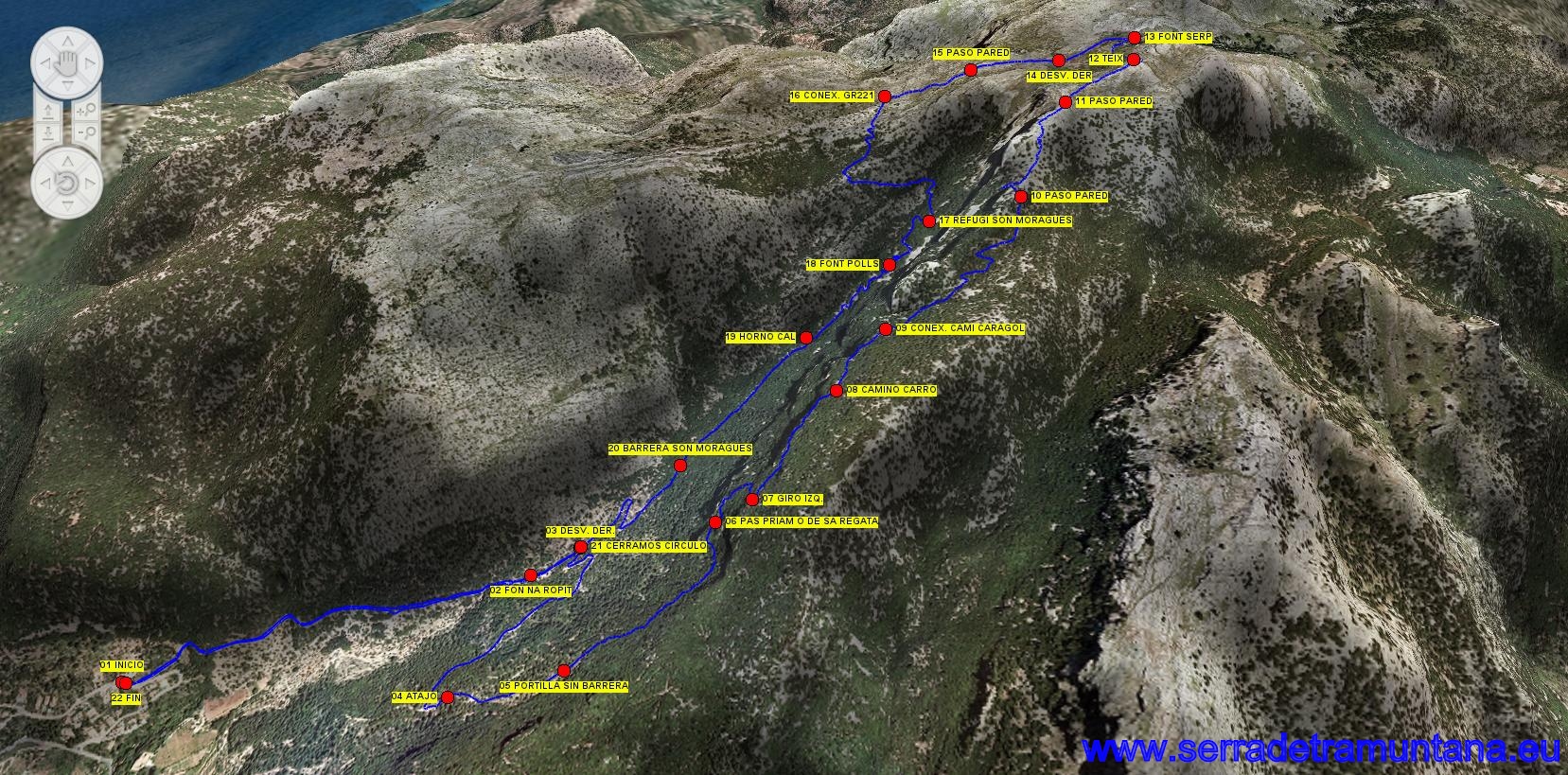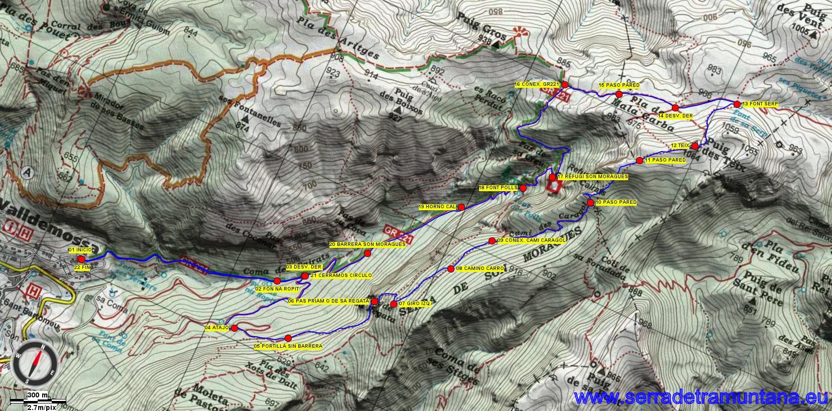 Para llegar al inicio de la ruta, vamos hacia Valldemossa desde Palma y poco antes de llegar al pueblo, a la derecha encontramos la calle Austria. Al poco de entrar en la calle hay una bifurcación y seguimos por la izquierda, en sentido ascendente. Después de una curva cerrada a izquierdas, a nuestra derecha, se encuentra el camino de la Coma des Cairats, donde iniciamos la ruta de hoy (WP01). Este camino, por el que regresaremos, forma parte del GR221.