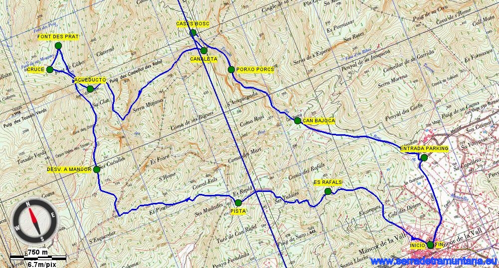 Haremos una ruta circular partiendo desde Mancor de la Vall, no apta para personas que padezcan de vértigo. Dejamos el coche en las inmediaciones de la calle Margalida Sintes y empezamos a caminar por la carretera que va hacia Caimari hasta el parking de un restaurante abandonado a la izquierda de la carretera (15’), cerca de las casas de Massanella. A la izquierda de la barrera del parking, hay un paso entre la rejilla y la columna. Accedemos por este paso al parking y vamos a la izquierda, hacia una vieja barrera metálica de acceso a una pista.