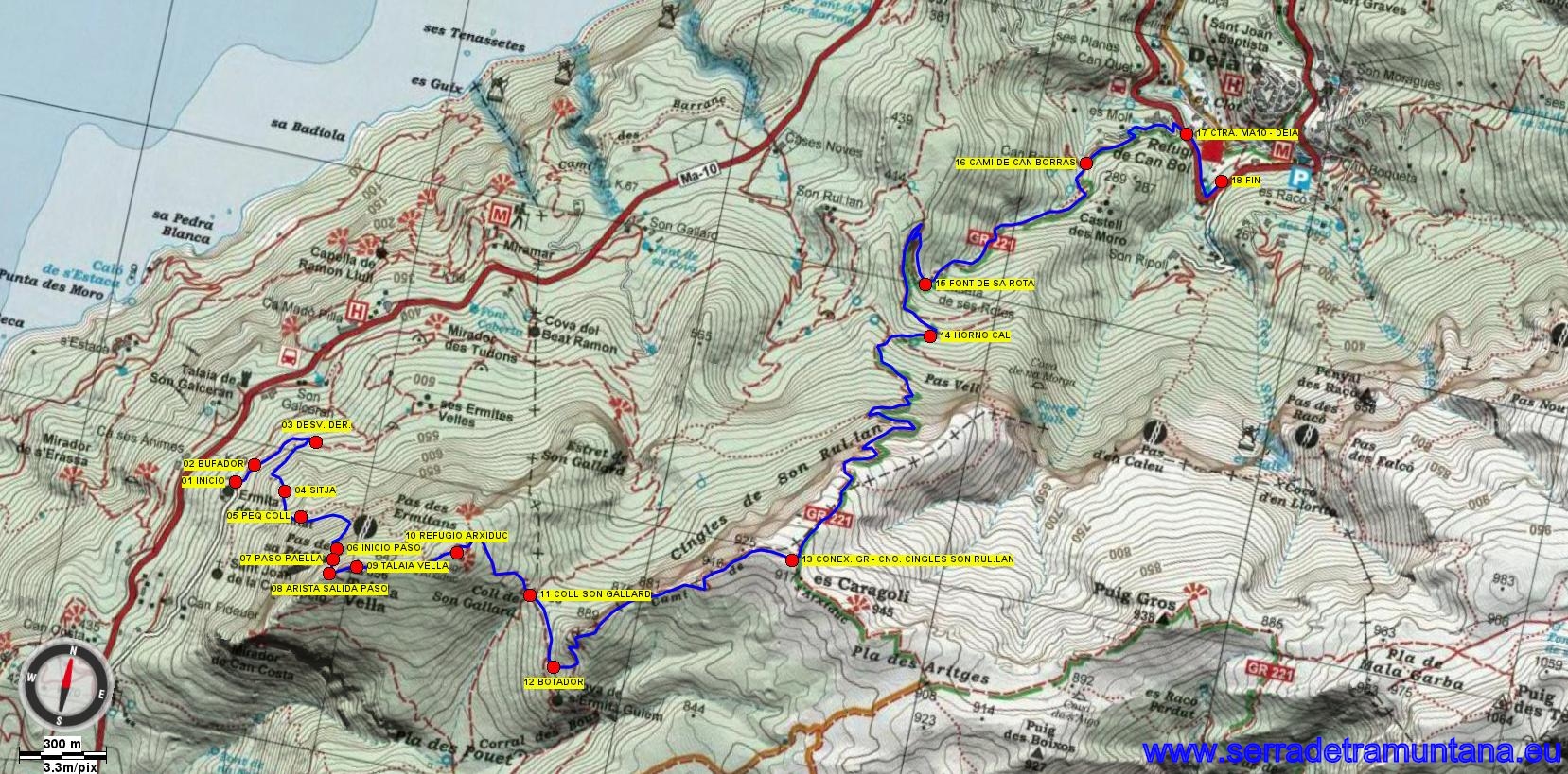 Empezamos a caminar en la ermita de la Trinitat, dirección Norte, pasando una vieja rejilla y tomando a la derecha la primera bifurcación, que nos deja enseguida en lo conocido como Es Bufador, con su mesa de piedra y fuente (WP02). Seguimos el camino que pasa por encima del Bufador y tenemos que estar al tanto para tomar algo más arriba el desvío a la derecha (WP03), que nos subirá hacia la zona bajo Sa Talaia Vella, donde se encuentra el paso que buscamos.