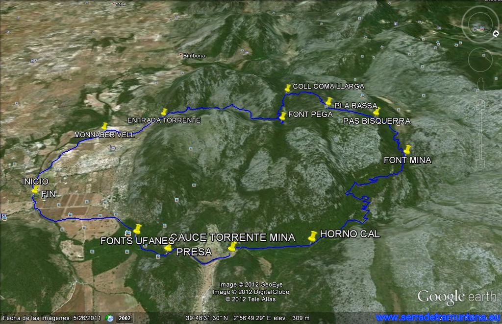 A los 5’ tomamos a la derecha el desvío hacia Monnàber y seguimos todas las indicaciones hasta el agroturismo de Monnàber Vell (17’). Aquí la pista hace un giro a la derecha, quedando el agroturismo a nuestra izquierda. Seguimos esta pista que se adentra en un olivar y se convierte en camino para adentrarse en el Torrent d’en Carrós (17’) a la izquierda de una pared de piedra. Subimos por el cauce del torrente y pasamos por el ojo de un puente (2’).