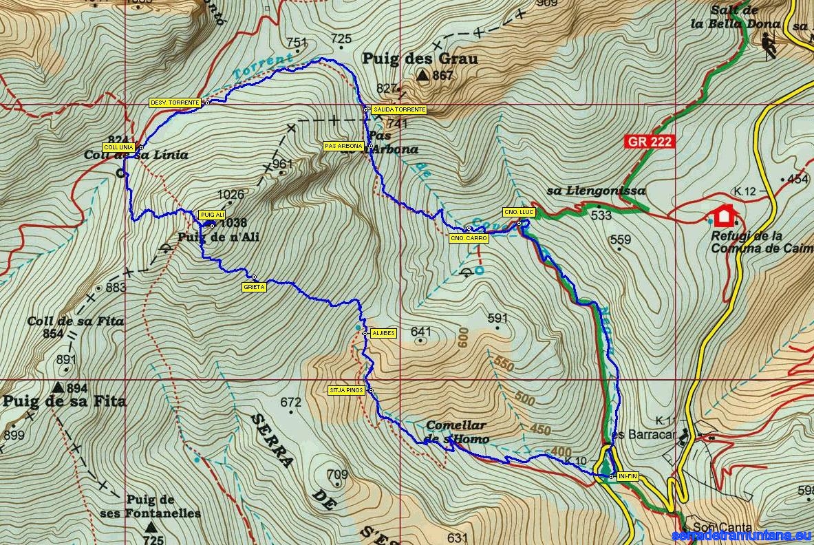 Mapa: En el Tramuntana Norte E-25 de Alpina está toda la zona y la mayor parte de los caminos. No está indicada la subida en la zona rocosa.