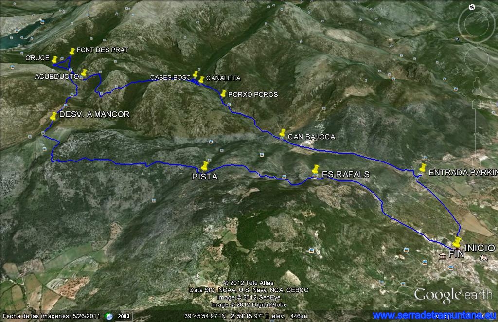 Obviando cualquier ramal secundario, llegamos en 26’ a las casas de Es Rafals. A partir de aquí la pista se transforma en carreterilla asfaltada que va bajando suavemente hasta el mismo punto de Mancor, donde a primera hora de la mañana habíamos iniciamos la ruta y al que llegamos en 26’ desde Es Rafals.